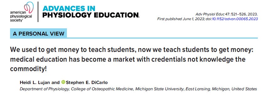This trend is in parallel, or perhaps part of, another shift in medical education that views students as consumers seeking to purchase medical credentials, not merely high-achieving students that have earned only the opportunity to pursue them. A recently published article by Heidi Lujan and Stephen DiCarlo of Michigan State University finally puts the consumer model of medical education and collective experiences of myself and many colleagues in stark perspective.
