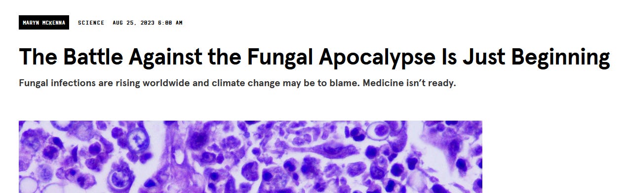 Yet the fungal apocalypse theme keeps reappearing in media articles, with the latest in Wired titled, “The Battle Against the Fungal Apocalypse is Just Beginning.” The doom-laden title is meant to attract eyeballs, and as I wrote in Fear of a Microbial Planet, selling fear always works like a charm. Proof of my point—this title is over-the-top fearmongering, and now I’m writing an article about it.